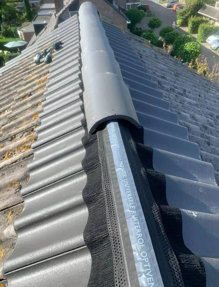 Een ventilerende (zwevende) nokvorst ligt los op een ondervorst en zorgt voor ventilatie onder de dakpannen.
